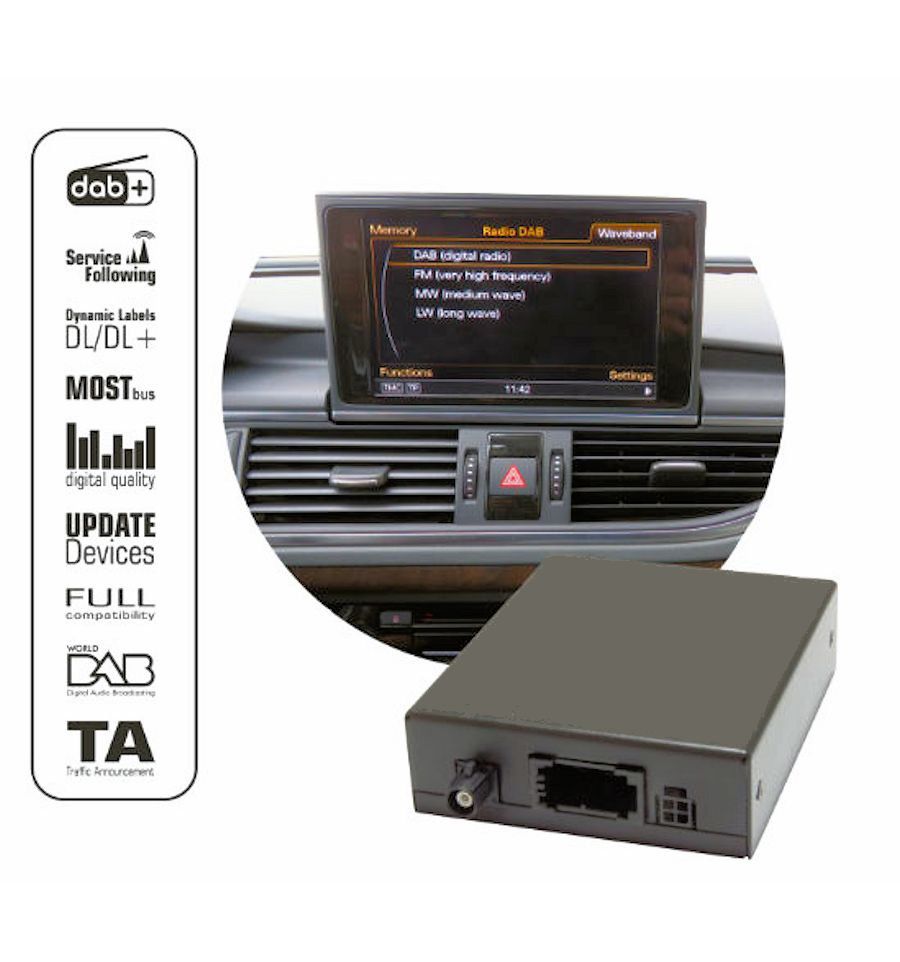 Digital DAB / DAB + tuner for factory AUDI MMI3G/3G+ allows to receive digital radio services DAB / DAB +. The device has function of tracking selected service while driving Service Following.