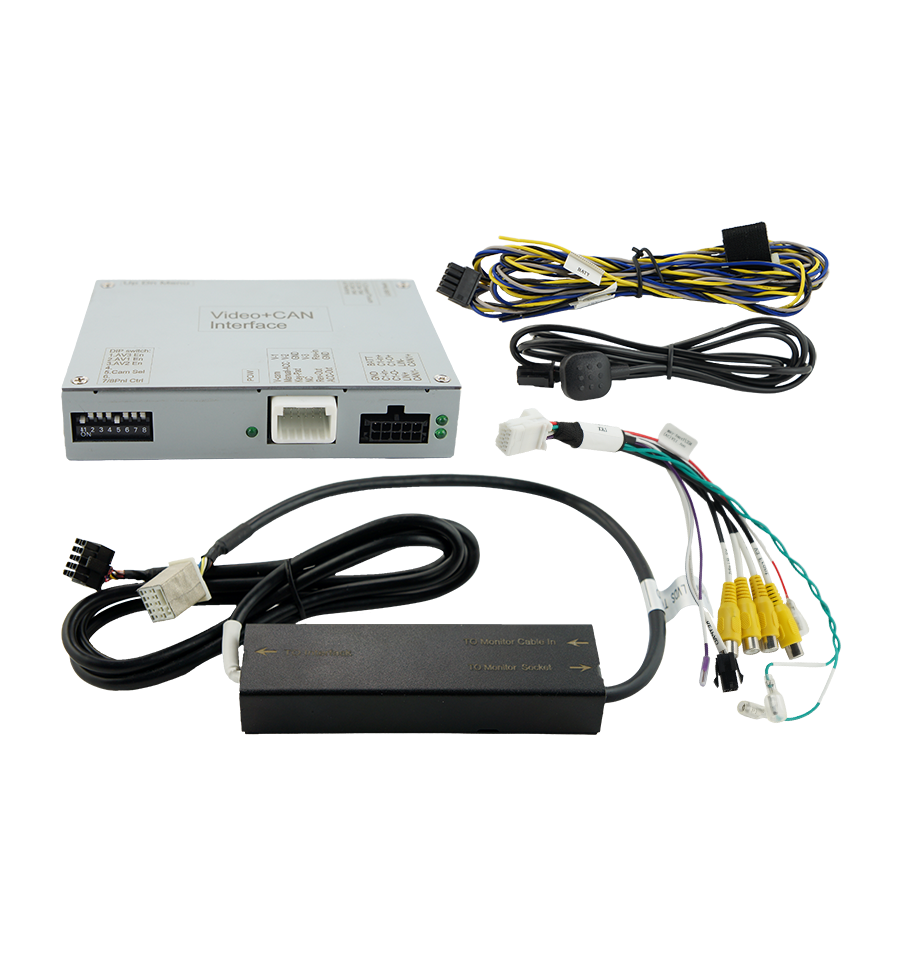 The video-interface allows to insert a rear-view camera, a front camera with auto switching and two additional video sources (e.g. USB-player, DVB-T2 tuner, ...) to the factory-infotainment system of the vehicle manufacturer..