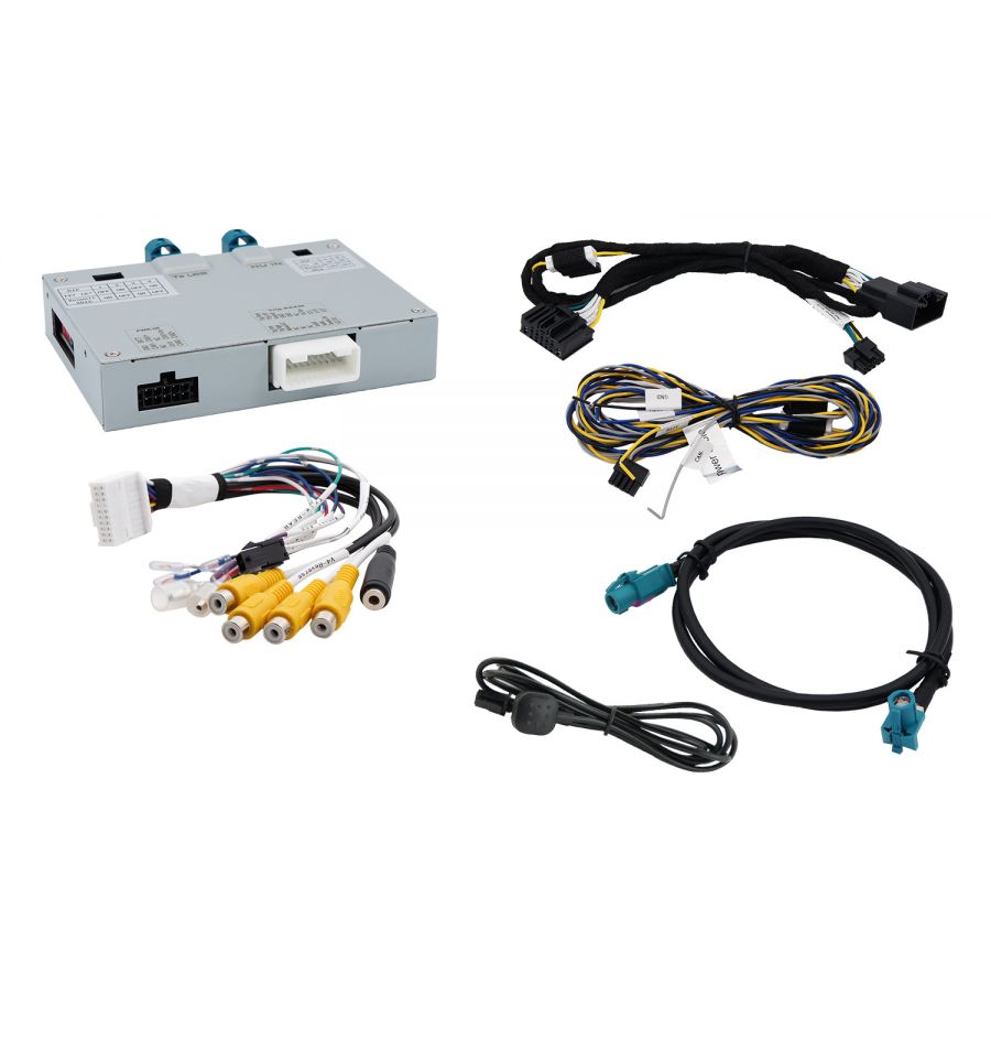 Video inserter for rear-view-camera, front camera with auto switching and 2 further video-inputs. CVBS and AHD compatible. Additional HDMI input. Compatible with VW vehicles with 13 inch monitor. .