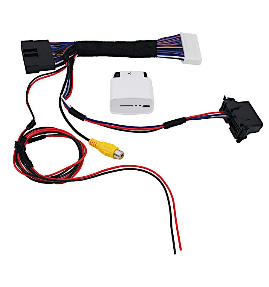 Rear-view camera input activator for retrofitting an aftermarket rear-view camera to the factory infotainment system. Compatible with NTSC rear-view cameras with RCA connection (CVBS).