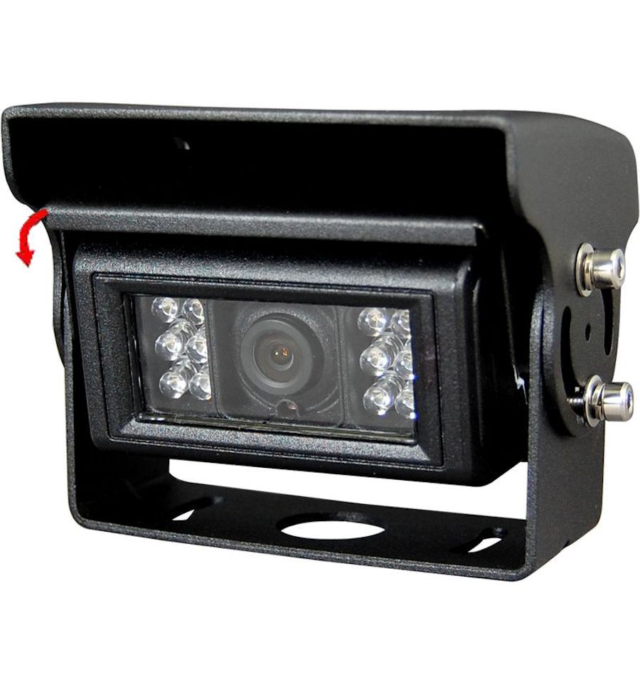 Telecamera di retromarcia PAL con supporto esterno, sensore CCD da 1/3 di pollice, angolo di campo diagonale di 120°, 12 LED per la visione notturna e sistema di chiusura automatica. Con funzione immagine riflessa (speculare)